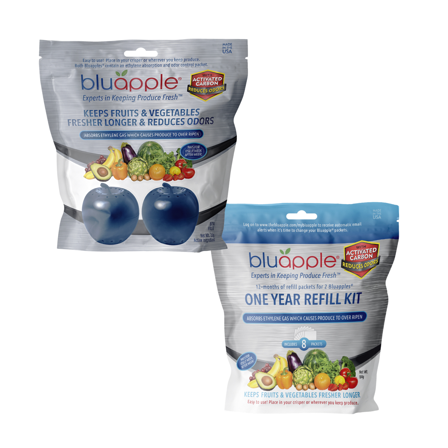 The Bluapple® with Activated Carbon 15-Month Bundle contains a Bluapple® 2-Pack with two Carbon Bluapples®, each pre-filled with an ethylene gas and odor absorbent packet that will last up to three months and a Bluapple with Activated Carbon® One-Year Refill Kit which contains 8 replacement packets. The Refill Kit is a resealable foil pack that will protect your replacement packets and keep them potent indefinitely when closed completely.