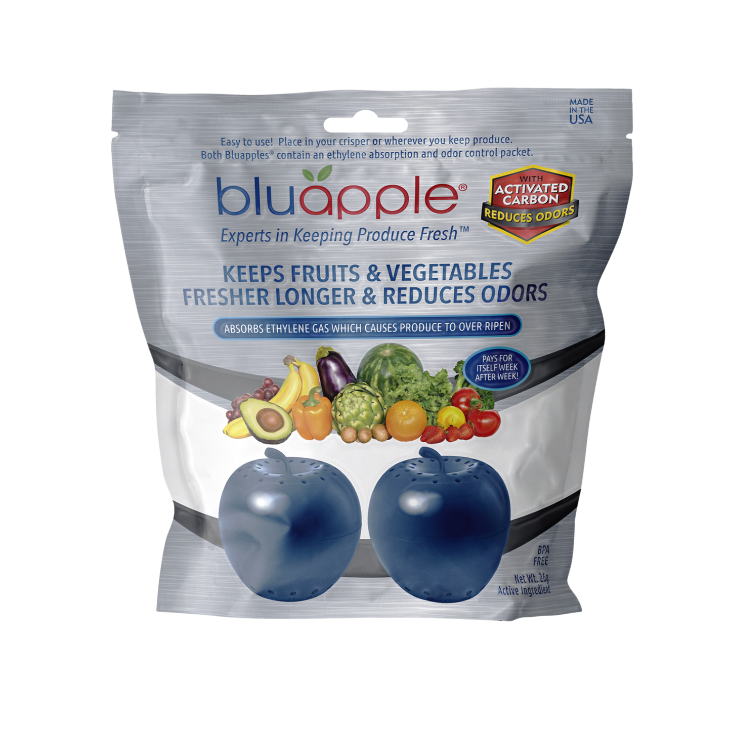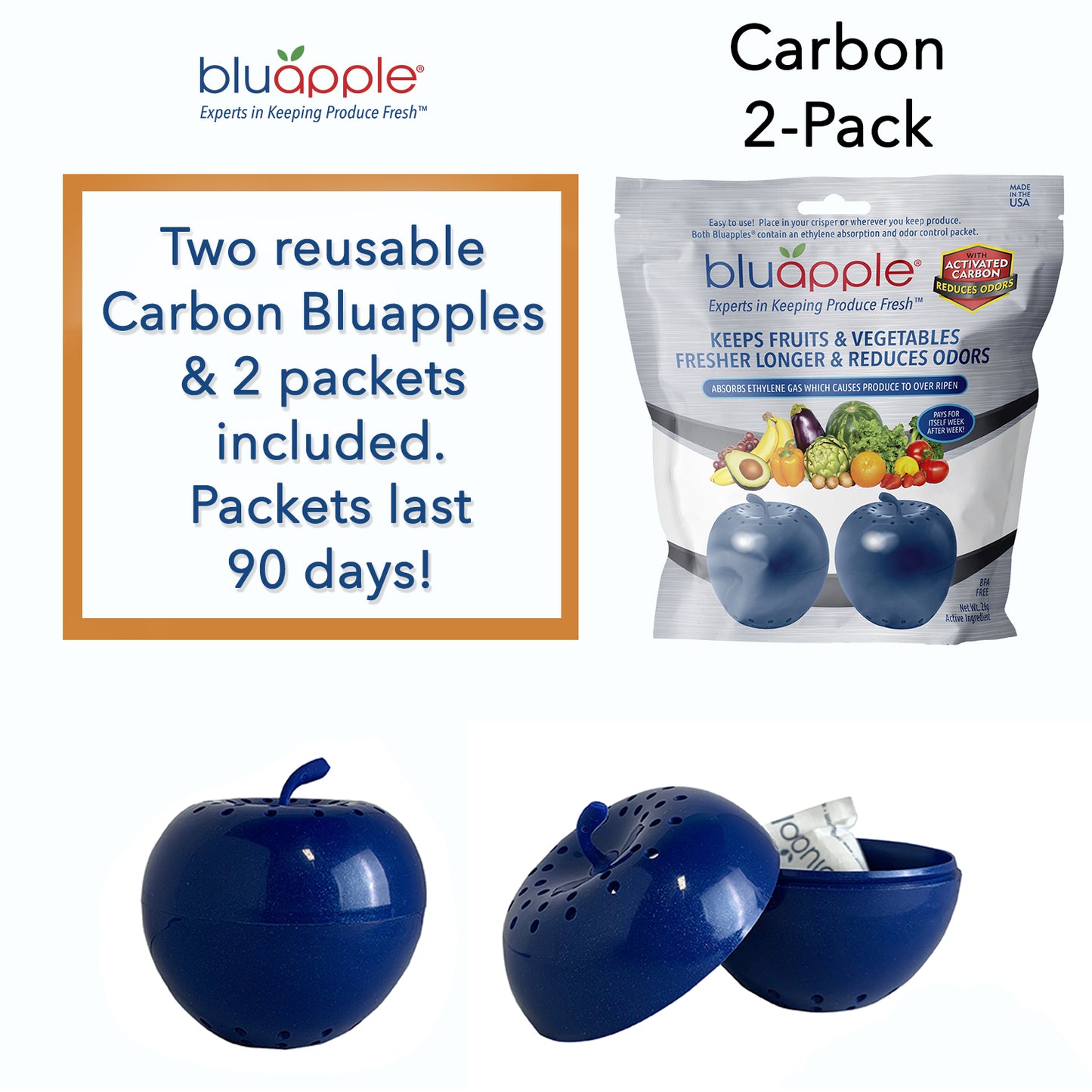 The Bluapple® 2-Pack with Activated Carbon contains two Bluapples®, each pre-filled with a packet containing an ethylene gas absorbing active ingredient and odor absorbing activated carbon that will last for at least three months. Also included is a detailed instruction sheet filled with proven methods and strategies for keeping your produce fresh longer