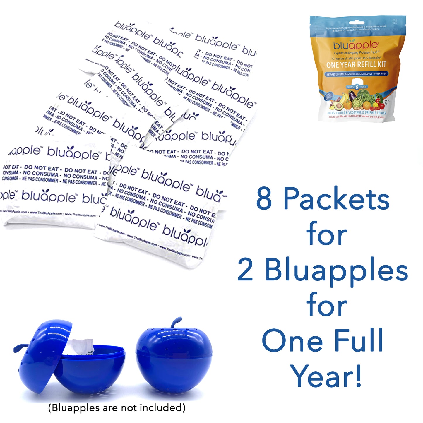 The Bluapple® One Year Refill Kit contains 8 replacement ethylene gas absorbent packets, enough for two Bluapples® for a full year of protection. Also included is a handy produce chart to help you remember the Produceology™ of various produce varieties. The Refill Kit is a resealable foil bag, that when completely closed, will protect your replacement packets and keep them potent indefinitely. Bluapples sold separately.